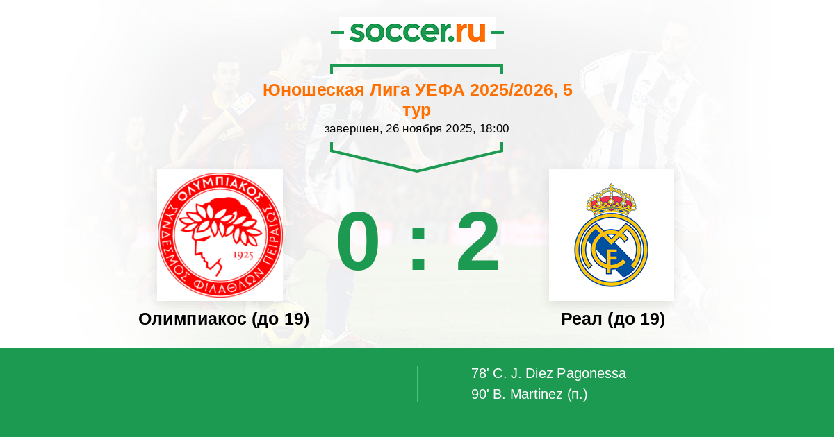 Протокол матча Олимпиакос (до 19) против Реал (до 19)
