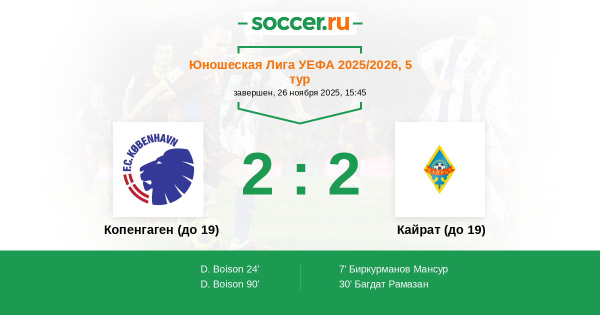 Протокол матча Копенгаген (до 19) против Кайрат (до 19)