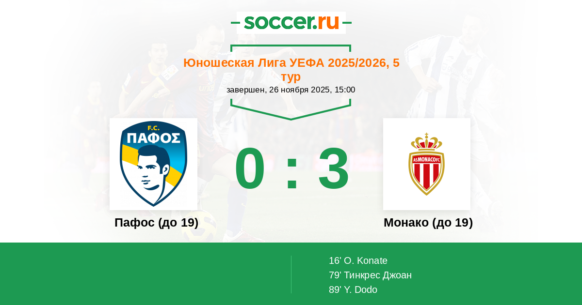 Протокол матча Пафос (до 19) против Монако (до 19)