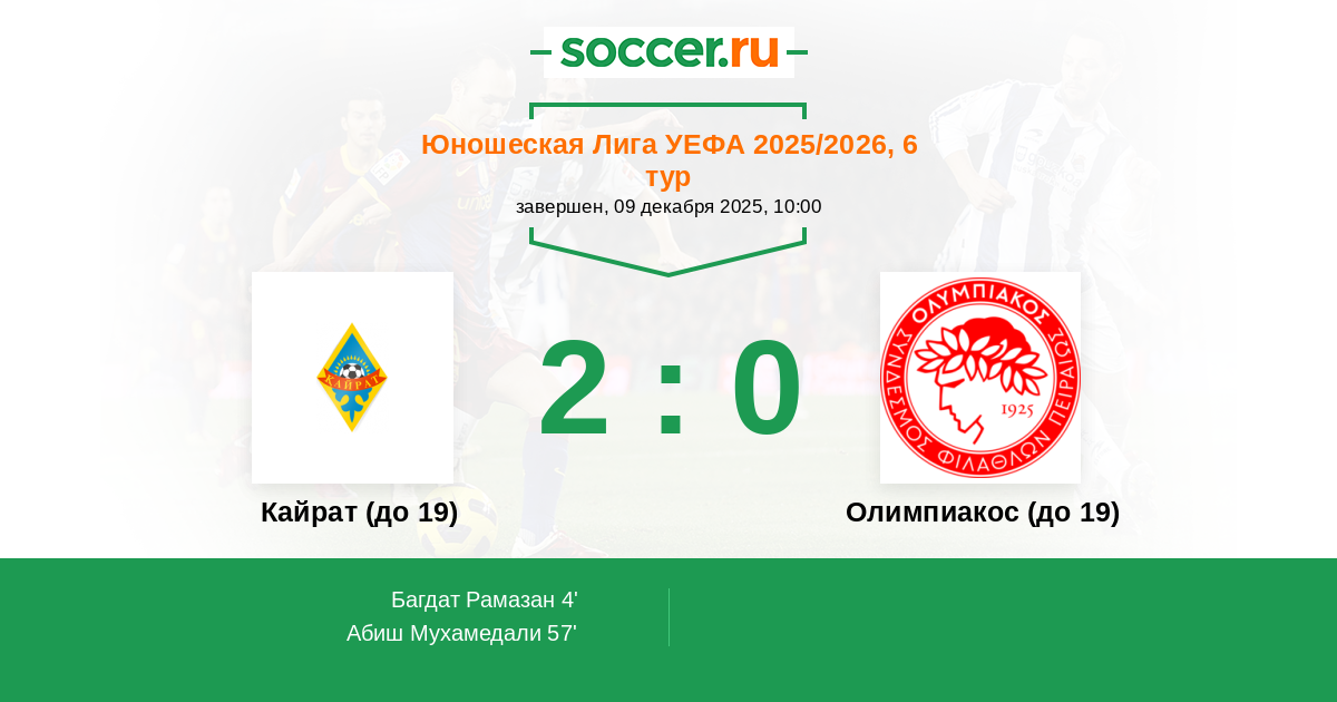 Протокол матча Кайрат (до 19) против Олимпиакос (до 19)