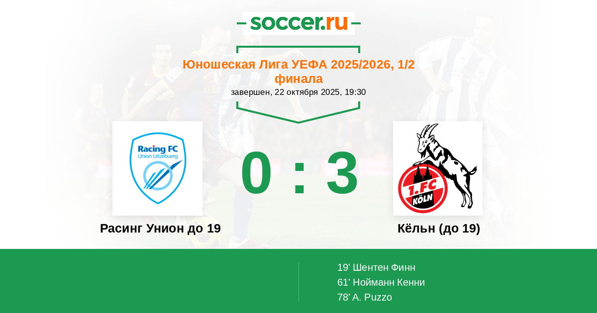 Протокол матча Расинг Унион до 19 против Кёльн (до 19)