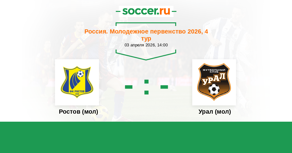 Россия. Премьер-Лига U21 30.03.2019 Ростов (мол) Логотип футбольный клуб Ростов (мол) (Ростов-на-Дону) 2:0 Логотип футбольный клуб Урал (мол) (Екатеринбург) Урал (мол)