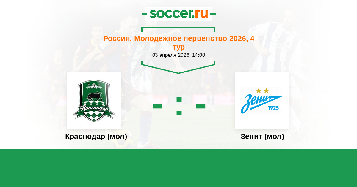Россия. Премьер-Лига U21 31.03.2023 Краснодар (мол) Логотип футбольный клуб Краснодар (мол) 3:1 Логотип футбольный клуб Зенит (мол) (Санкт-Петербург) Зенит (мол)