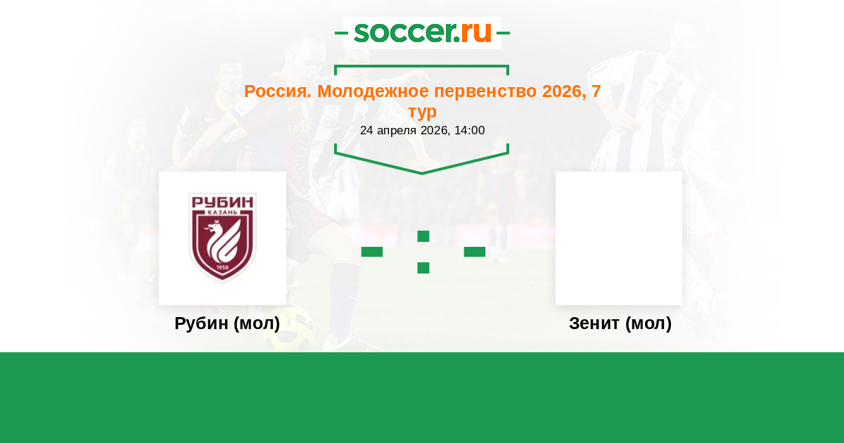 Россия. Премьер-Лига U21 07.11.2025 Рубин (мол) Логотип футбольный клуб Рубин (мол) (Казань) 2:3 Логотип футбольный клуб Зенит (мол) (Санкт-Петербург) Зенит (мол)