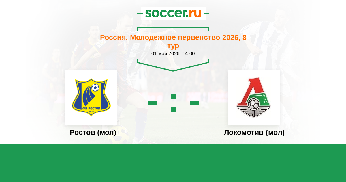 Россия. Премьер-Лига U21 23.04.2019 Ростов (мол) Логотип футбольный клуб Ростов (мол) (Ростов-на-Дону) 0:2 Логотип футбольный клуб Локомотив (мол) (Москва) Локомотив (мол)