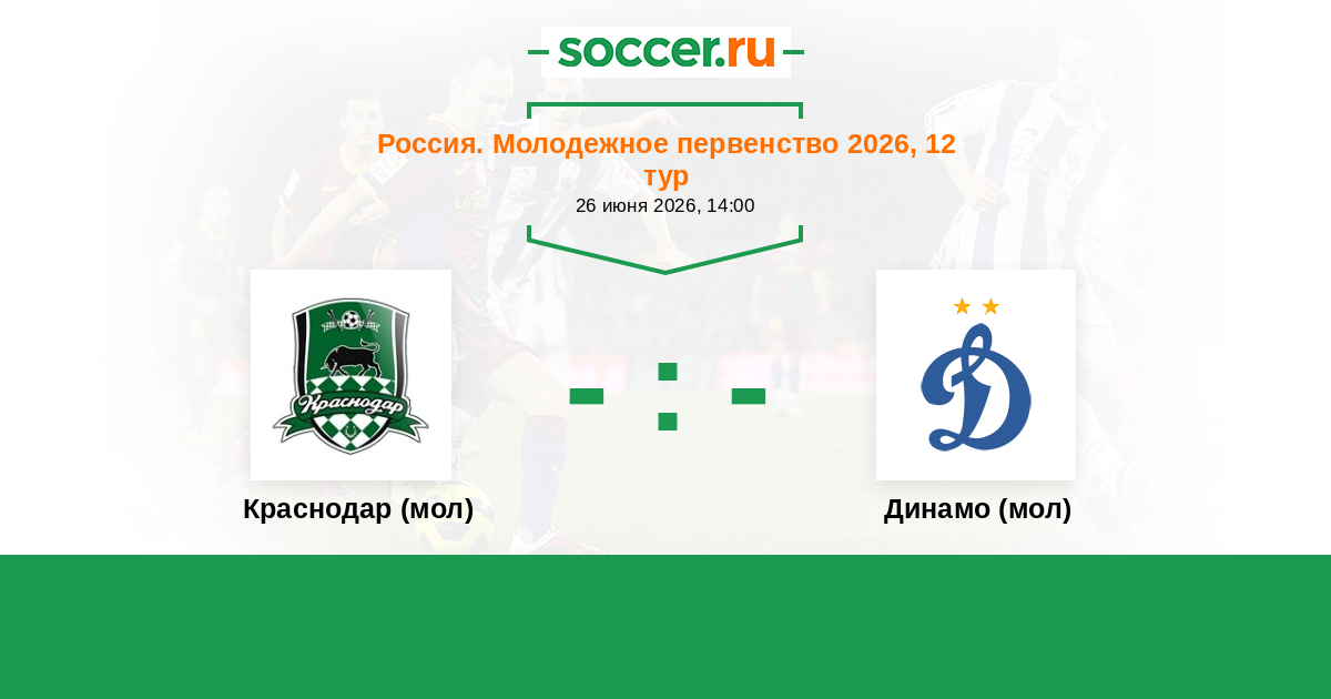 Россия. Премьер-Лига U21 19.04.2014 Динамо (мол) Логотип футбольный клуб Динамо (мол) (Москва) 2:0 Логотип футбольный клуб Краснодар (мол) Краснодар (мол)