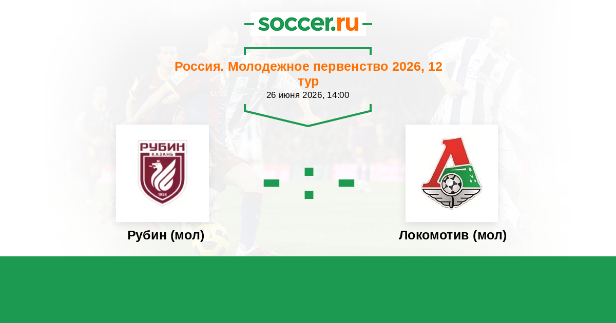 Россия. Премьер-Лига U21 14.07.2019 Локомотив (мол) Логотип футбольный клуб Локомотив (мол) (Москва) 3:0 Логотип футбольный клуб Рубин (мол) (Казань) Рубин (мол)