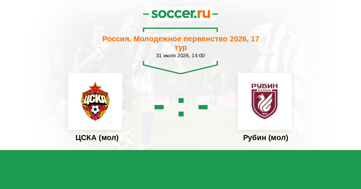 Россия. Премьер-Лига U21 30.08.2017 ЦСКА (мол) Логотип футбольный клуб ЦСКА (мол) (Москва) 3:1 Логотип футбольный клуб Рубин (мол) (Казань) Рубин (мол)
