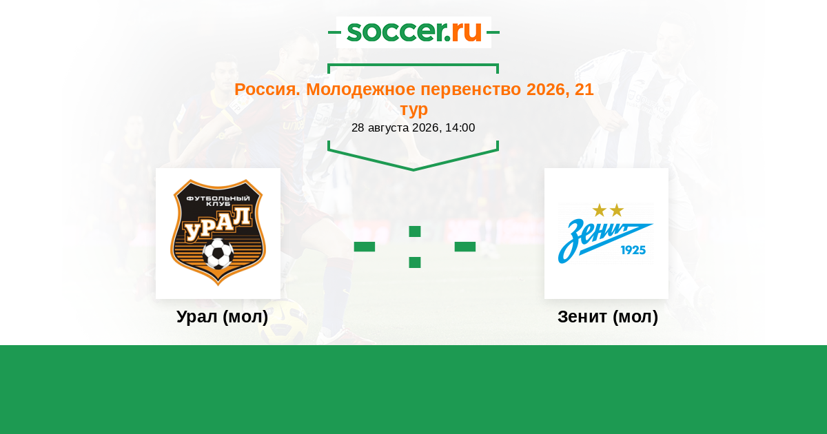 Россия. Премьер-Лига U21 15.08.2025 Урал (мол) Логотип футбольный клуб Урал (мол) (Екатеринбург) 1:6 Логотип футбольный клуб Зенит (мол) (Санкт-Петербург) Зенит (мол)