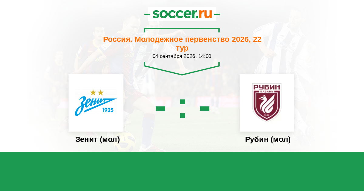 Россия. Премьер-Лига U21 12.08.2018 Рубин (мол) Логотип футбольный клуб Рубин (мол) (Казань) 3:0 Логотип футбольный клуб Зенит (мол) (Санкт-Петербург) Зенит (мол)