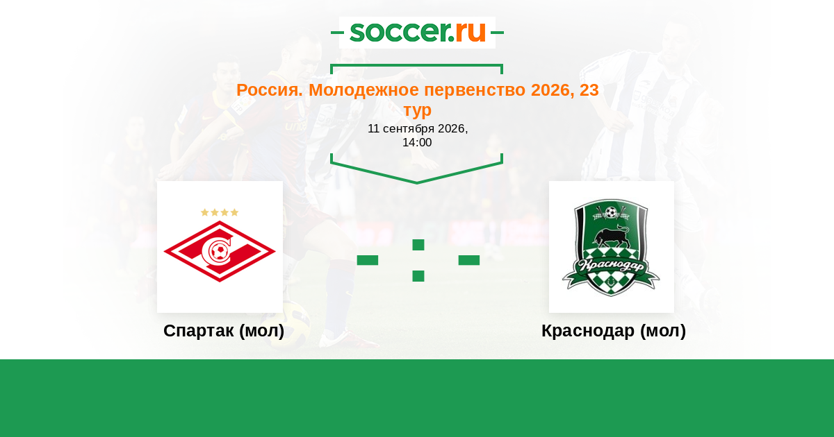 Россия. Премьер-Лига U21 29.09.2020 Краснодар (мол) Логотип футбольный клуб Краснодар (мол) 1:1 Логотип футбольный клуб Спартак (мол) (Москва) Спартак (мол)