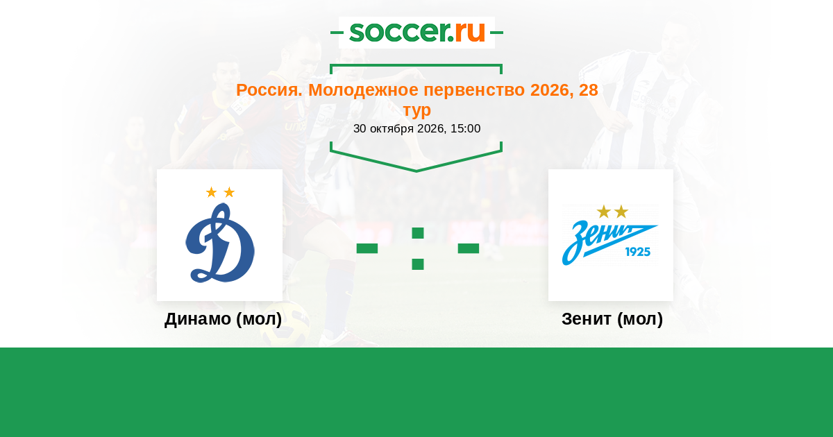 Россия. Премьер-Лига U21 26.03.2010 Динамо (мол) Логотип футбольный клуб Динамо (мол) (Москва) 0:2 Логотип футбольный клуб Зенит (мол) (Санкт-Петербург) Зенит (мол)