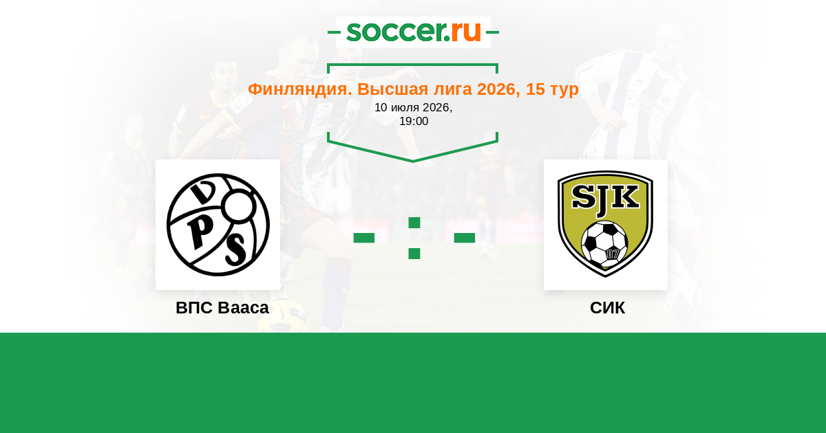 Финляндия. Высшая лига 13.07.2019 СИК Логотип футбольный клуб СИК (Сейняйоки) 1:0 Логотип футбольный клуб ВПС Вааса ВПС Вааса