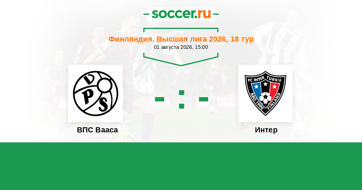 Финляндия. Высшая лига 31.08.2025 Интер Логотип футбольный клуб Интер (Турку) 2:1 Логотип футбольный клуб ВПС Вааса ВПС Вааса