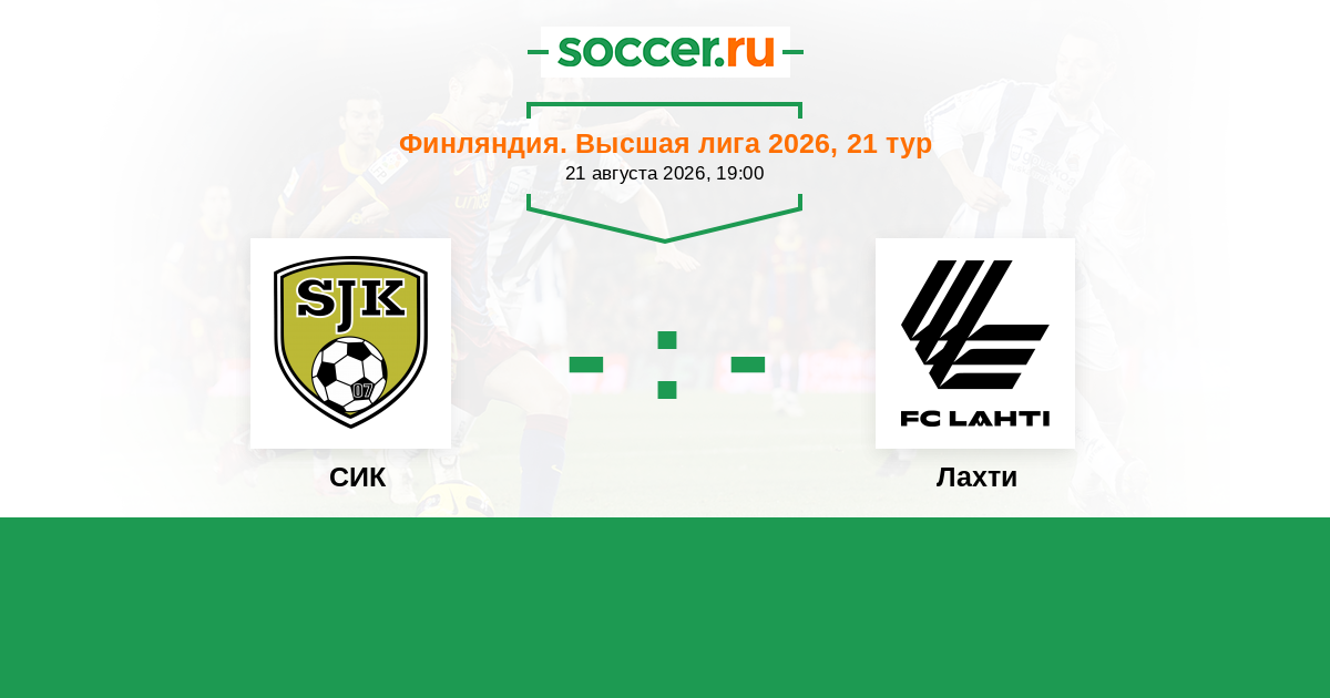 Финляндия. Высшая лига 26.07.2019 СИК Логотип футбольный клуб СИК (Сейняйоки) 0:2 Логотип футбольный клуб Лахти Лахти