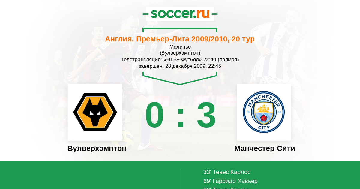 Протокол матча Вулверхэмптон против Манчестер Сити