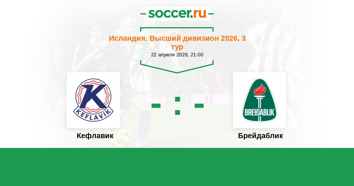 Исландия. Высший дивизион 19.04.2022 Брейдаблик Логотип футбольный клуб Брейдаблик (Коупавогюр) 4:1 Логотип футбольный клуб Кефлавик (Рейкьянесбар) Кефлавик