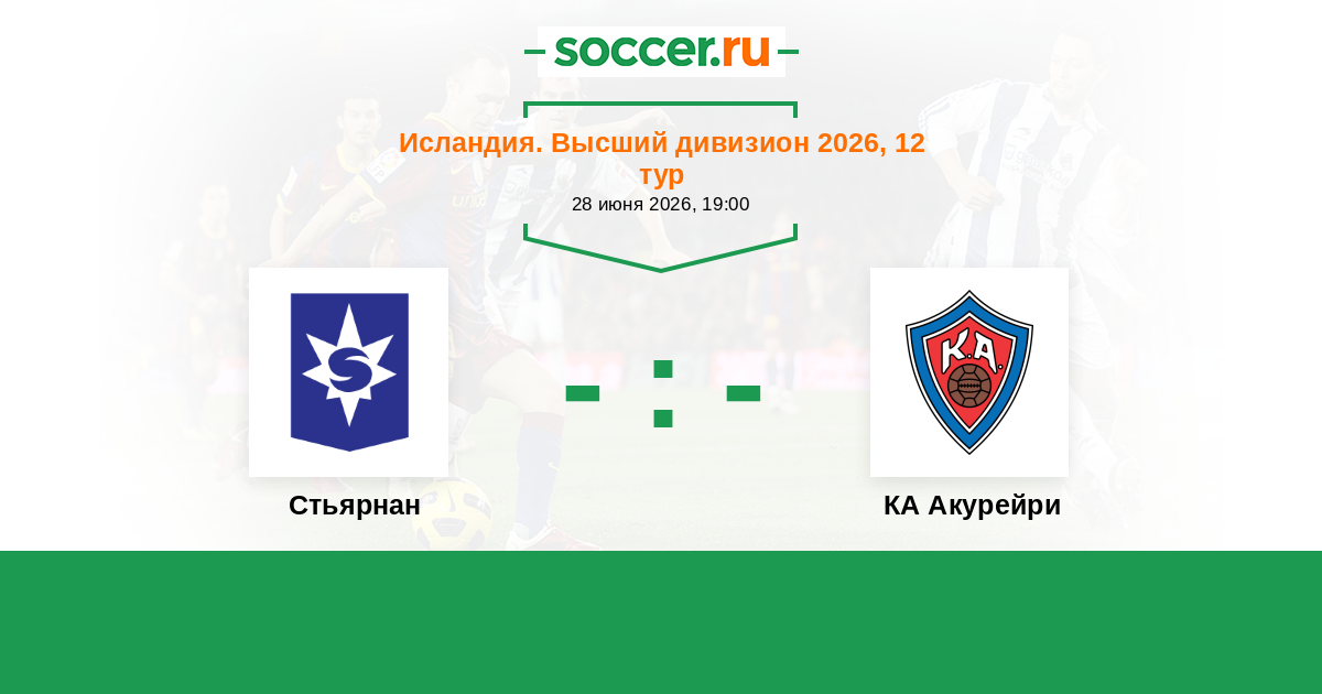 Исландия. Высший дивизион 19.05.2019 Стьярнан Логотип футбольный клуб Стьярнан (Гардабайр) 0:2 Логотип футбольный клуб КА Акурейри КА Акурейри