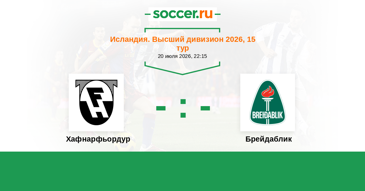 Исландия. Высший дивизион 22.07.2018 Брейдаблик Логотип футбольный клуб Брейдаблик (Коупавогюр) 4:1 Логотип футбольный клуб Хафнарфьордур Хафнарфьордур