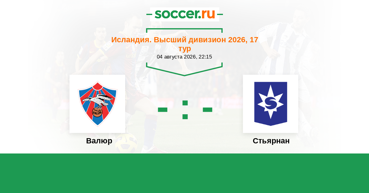Исландия. Высший дивизион 29.08.2018 Стьярнан Логотип футбольный клуб Стьярнан (Гардабайр) 1:1 Логотип футбольный клуб Валюр (Рейкьявик) Валюр