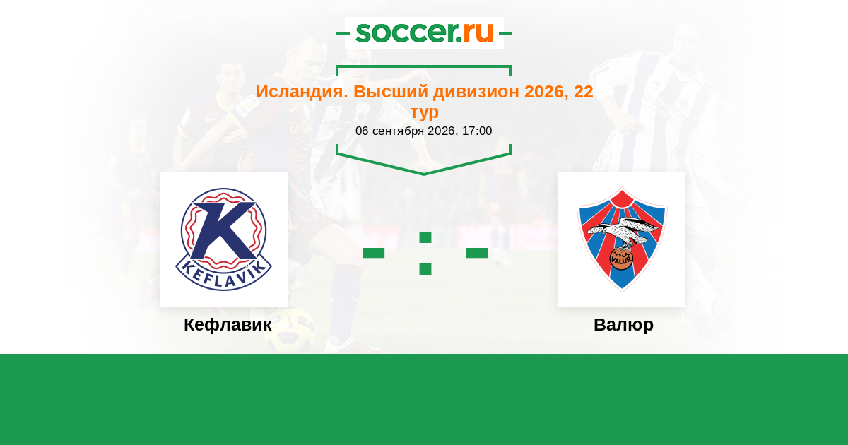 Исландия. Высший дивизион 01.07.2018 Кефлавик Логотип футбольный клуб Кефлавик (Рейкьянесбар) 0:2 Логотип футбольный клуб Валюр (Рейкьявик) Валюр