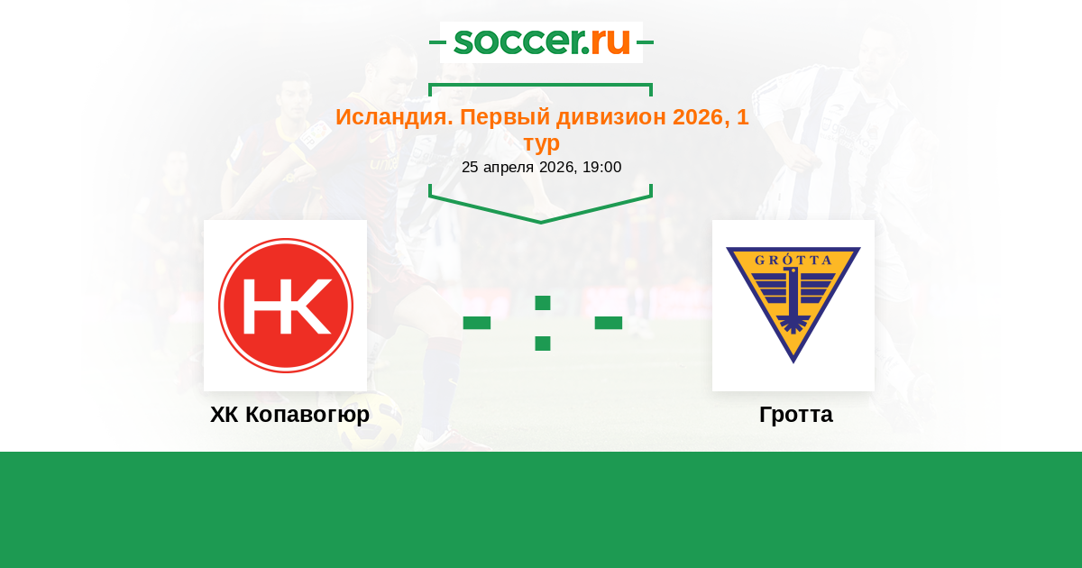Исландия. Первый дивизион 19.05.2022 Гротта Логотип футбольный клуб Гротта (Сельтьяднарнес) 2:0 Логотип футбольный клуб ХК Копавогюр (Копавогур) ХК Копавогюр