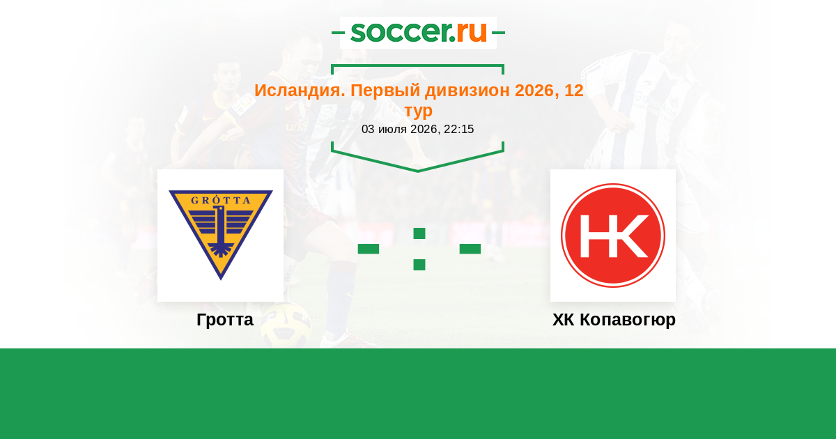 Исландия. Первый дивизион 19.05.2022 Гротта Логотип футбольный клуб Гротта (Сельтьяднарнес) 2:0 Логотип футбольный клуб ХК Копавогюр (Копавогур) ХК Копавогюр