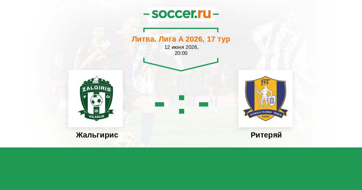 Литва. Лига А 28.06.2020 Ритеряй Логотип футбольный клуб Ритеряй (Тракай) 0:7 Логотип футбольный клуб Жальгирис (Вильнюс) Жальгирис