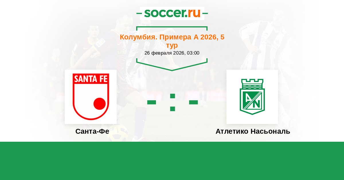 Колумбия. Примера А 13.02.2025 Санта-Фе Логотип футбольный клуб Санта-Фе (Богота) 2:2 Логотип футбольный клуб Атлетико Насьональ (Медельин) Атлетико Насьональ