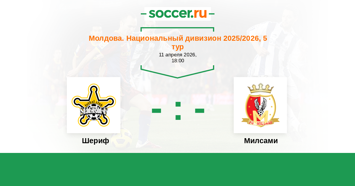 Молдова. Национальный дивизион 13.04.2025 Шериф Логотип футбольный клуб Шериф (Тирасполь) 2:2 Логотип футбольный клуб Милсами (Оргеев) Милсами