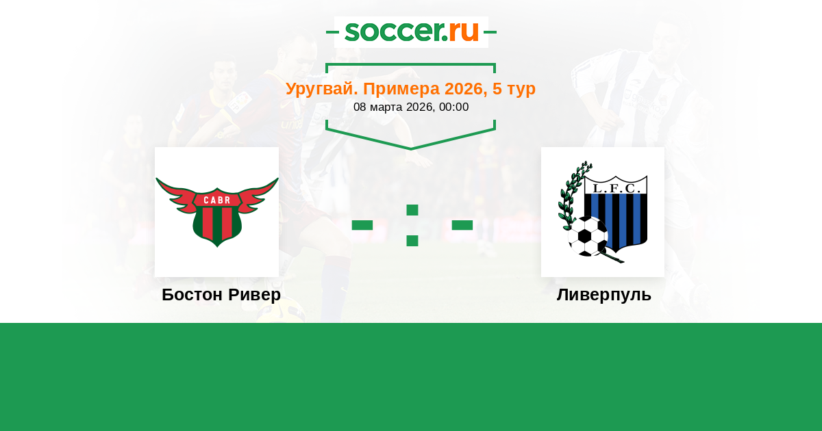 Уругвай. Примера A 17.02.2018 Ливерпуль Логотип футбольный клуб Ливерпуль (Монтевидео) 2:2 Логотип футбольный клуб Бостон Ривер (Монтевидео) Бостон Ривер