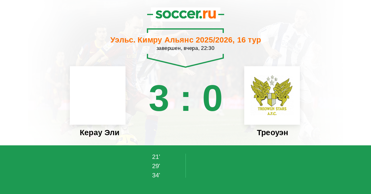 Керау Эли - Треоуэн ! В последнем очном матче , хозяева , которые тогда играли в гостях вынесли соперника в " одну калитку " . Предположу нечто подобное и в этом матче . ТБ .