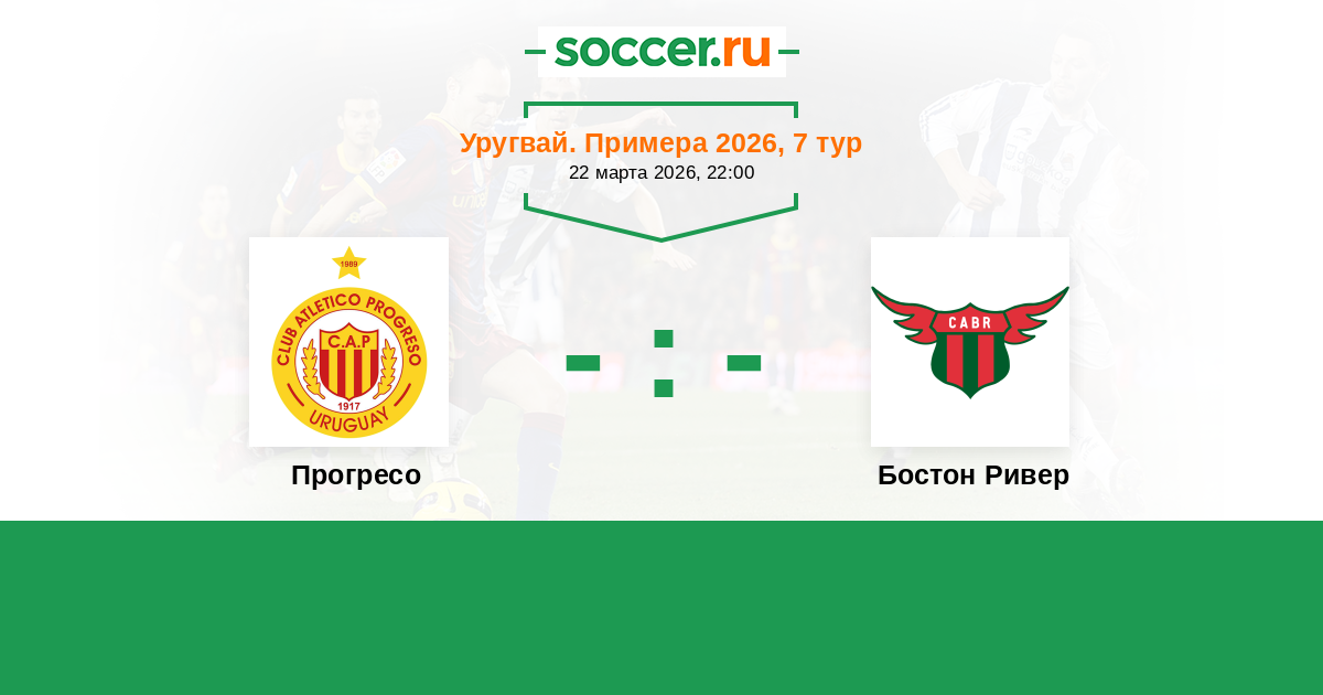 Уругвай. Примера A 24.03.2019 Прогресо Логотип футбольный клуб Прогресо (Монтевидео) 1:1 Логотип футбольный клуб Бостон Ривер (Монтевидео) Бостон Ривер