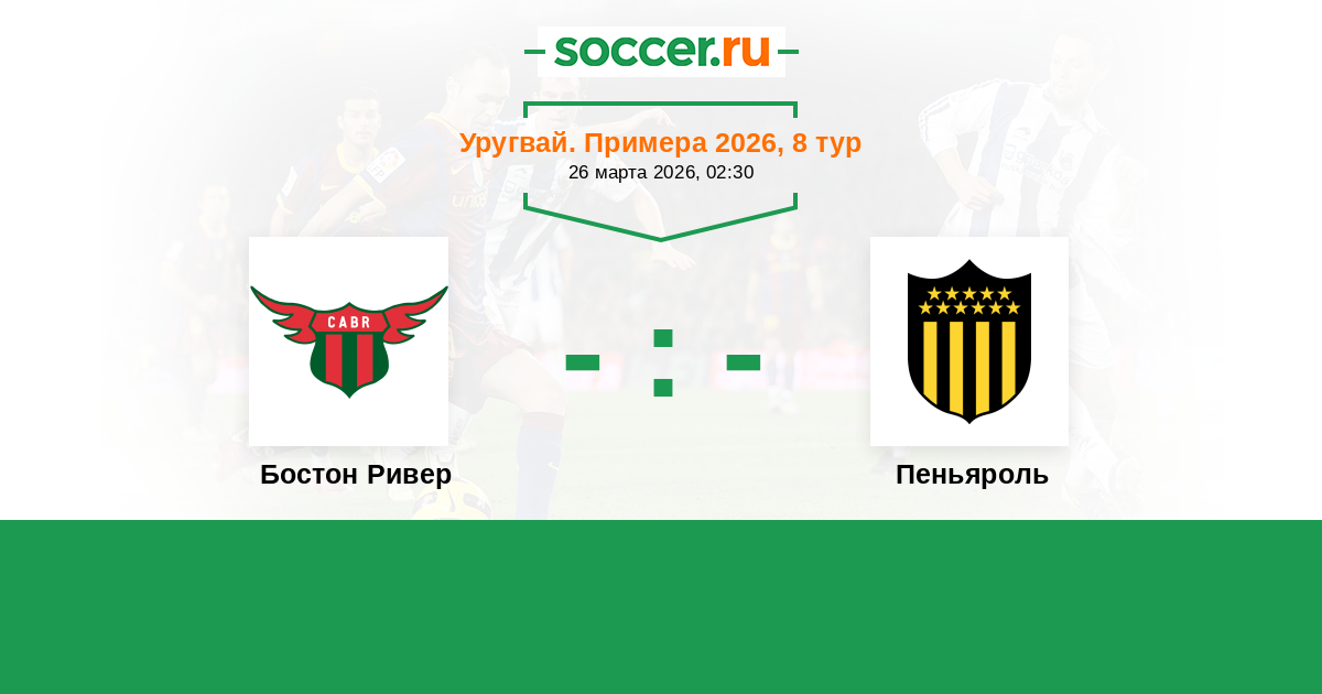 Уругвай. Примера A 10.03.2018 Пеньяроль Логотип футбольный клуб Пеньяроль (Монтевидео) 2:1 Логотип футбольный клуб Бостон Ривер (Монтевидео) Бостон Ривер