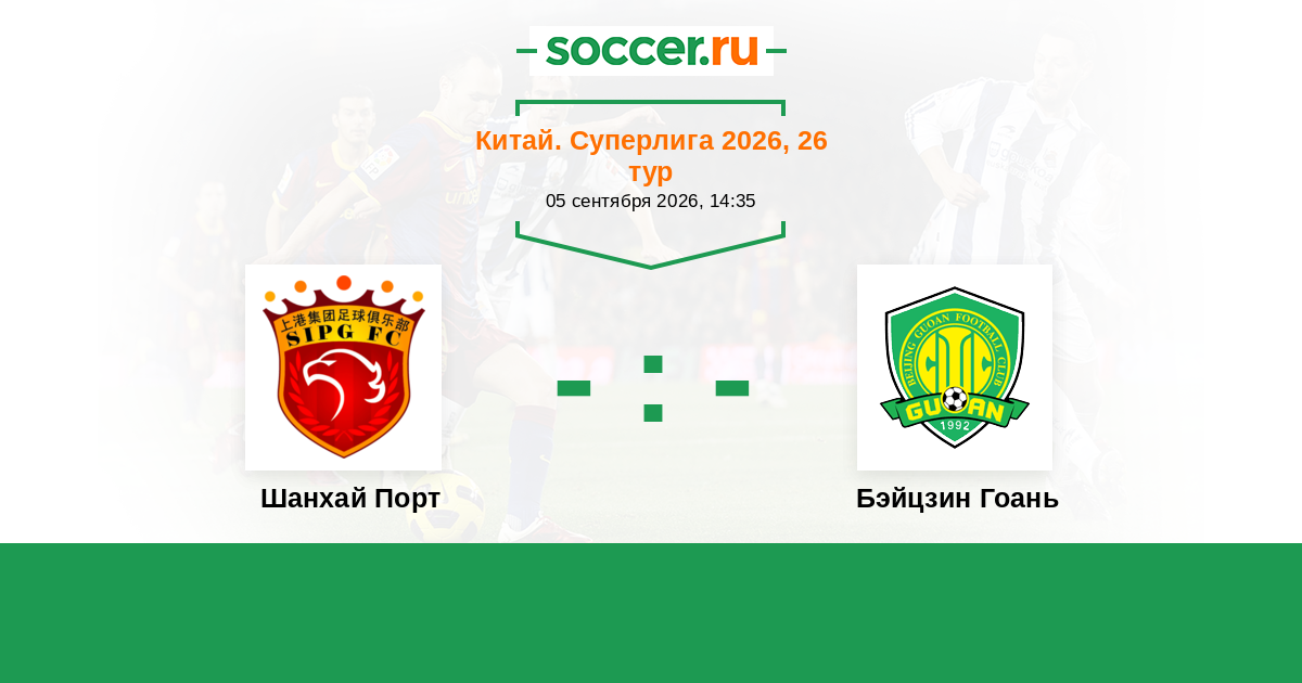 Китай. Суперлига 25.09.2020 Шанхай Порт Логотип футбольный клуб Шанхай Порт 1:0 Логотип футбольный клуб Бэйцзин Гоань (Пекин) Бэйцзин Гоань