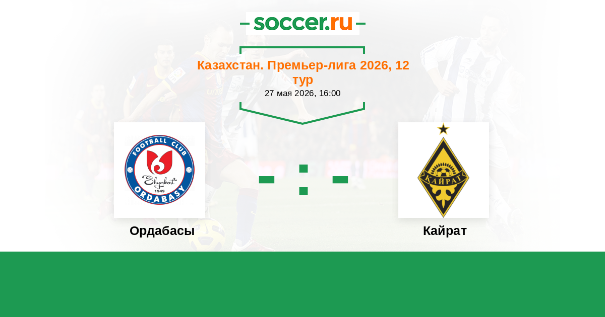Казахстан. Премьер-лига 27.04.2019 Ордабасы Логотип футбольный клуб Ордабасы (Шымкент) 0:0 Логотип футбольный клуб Кайрат (Алматы) Кайрат