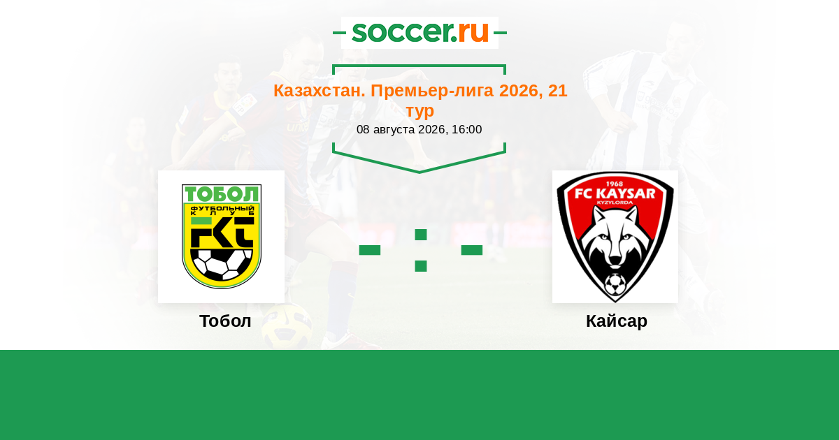 Казахстан. Премьер-лига 29.08.2020 Кайсар Логотип футбольный клуб Кайсар (Кызылорда) 2:1 Логотип футбольный клуб Тобол (Костанай) Тобол
