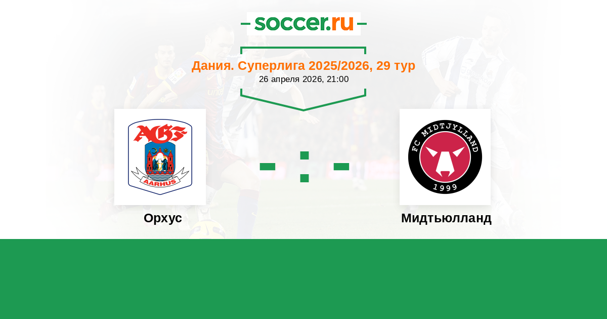Дания. Суперлига 03.11.2025 Мидтьюлланд Логотип футбольный клуб Мидтьюлланд (Хернинг) 1:1 Логотип футбольный клуб Орхус Орхус