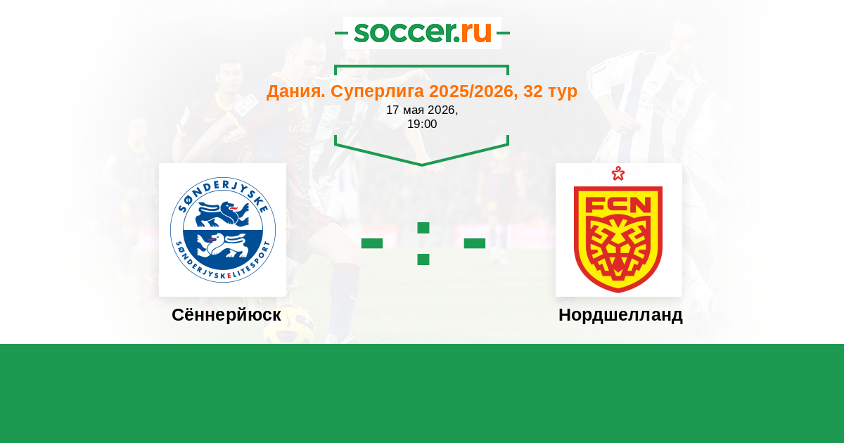 Дания. Суперлига 20.10.2019 Сённерйюск Логотип футбольный клуб Сённерйюск (Хадерслев) 1:4 Логотип футбольный клуб Нордшелланд (Фарум) Нордшелланд