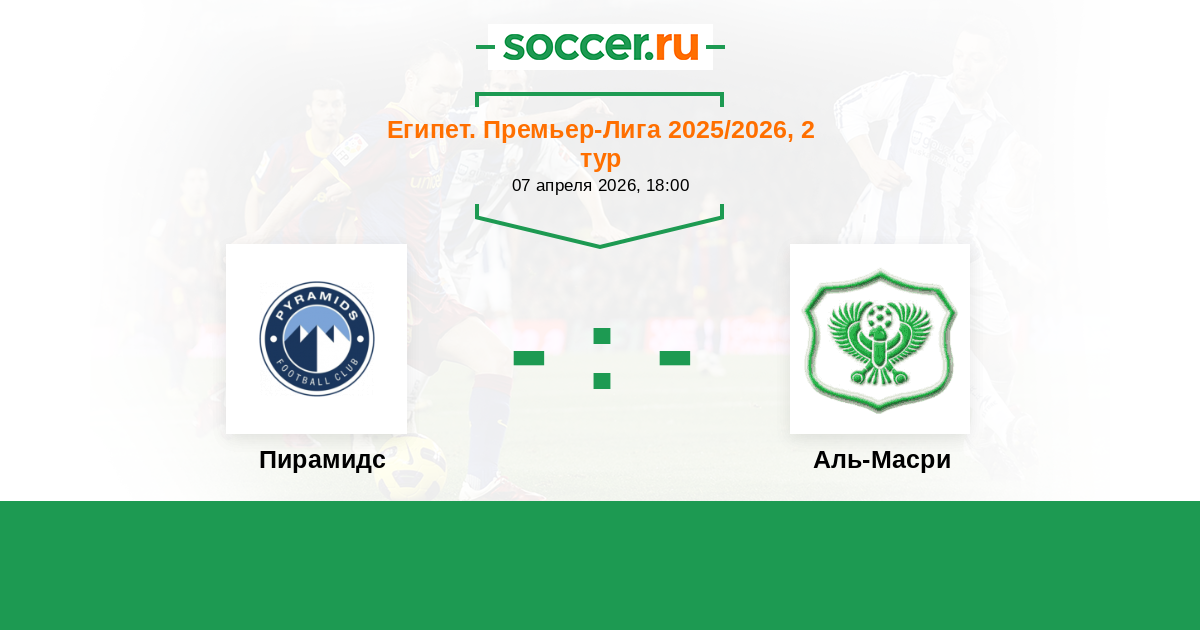 Египет. Премьер-Лига 19.08.2025 Аль-Масри Логотип футбольный клуб Аль-Масри (Порт-Саид) 2:2 Логотип футбольный клуб Пирамидс (Эль-Файюм) Пирамидс