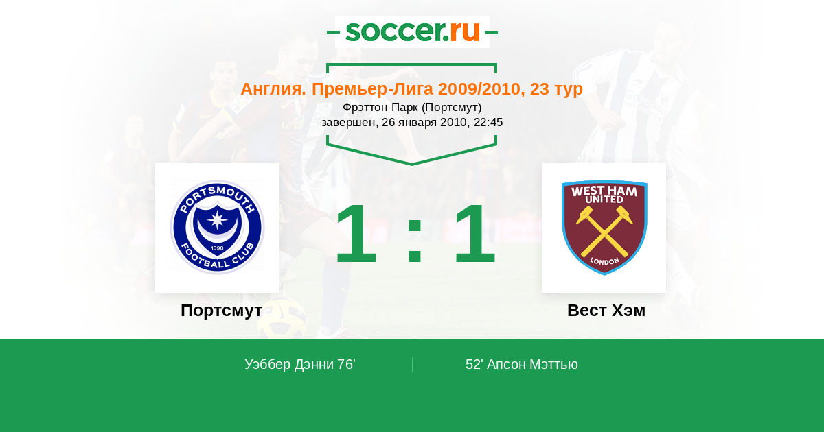 Протокол матча Портсмут против Вест Хэм