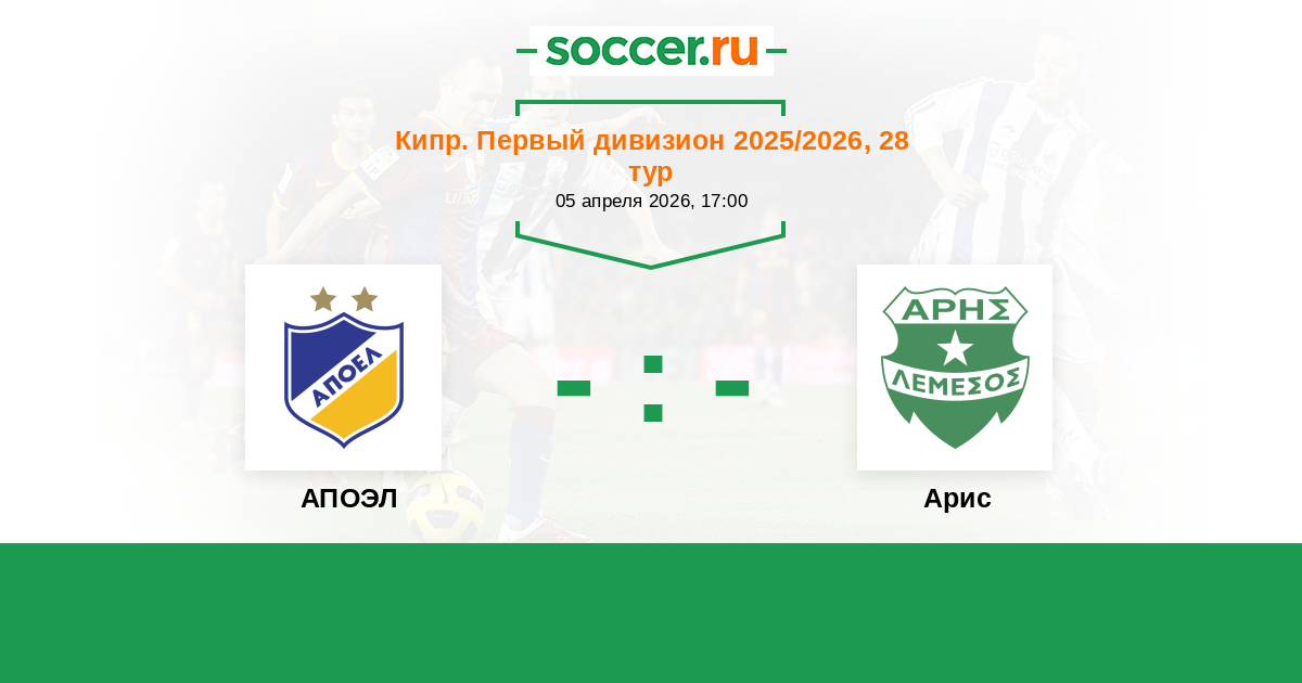 Кипр. Первый Дивизион 17.04.2022 Арис Логотип футбольный клуб Арис (Лимассол) 1:2 Логотип футбольный клуб АПОЭЛ (Никосия) АПОЭЛ