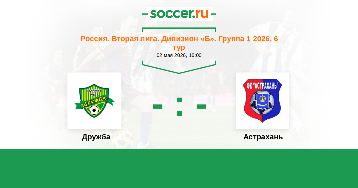 Россия. Вторая лига. Дивизион «Б». Группа 1 02.08.2025 Дружба Логотип футбольный клуб Дружба (Майкоп) 1:1 Логотип футбольный клуб Астрахань Астрахань