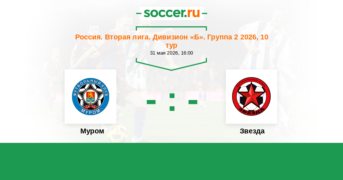 Россия. Вторая лига. Группа 2 23.04.2022 Муром Логотип футбольный клуб Муром 1:0 Логотип футбольный клуб Звезда (Санкт-Петербург) Звезда