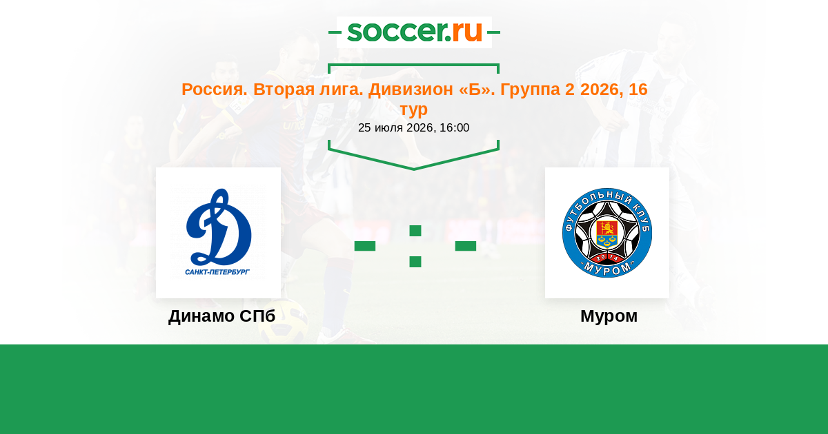 Россия. Вторая лига. Дивизион «Б». Группа 2 05.04.2026 Муром Логотип футбольный клуб Муром 0:3 Логотип футбольный клуб Динамо СПб (Санкт-Петербург) Динамо СПб