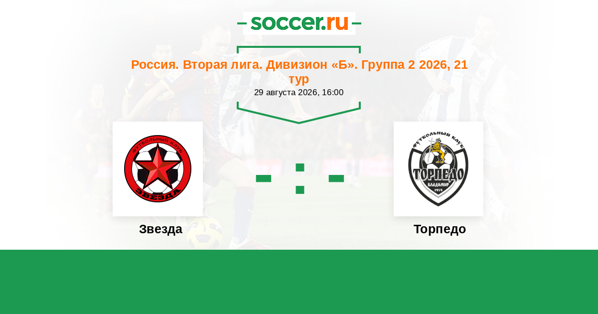 Россия. Вторая лига. Дивизион «Б». Группа 2 27.09.2025 Звезда Логотип футбольный клуб Звезда (Санкт-Петербург) 1:1 Логотип футбольный клуб Торпедо (Владимир) Торпедо