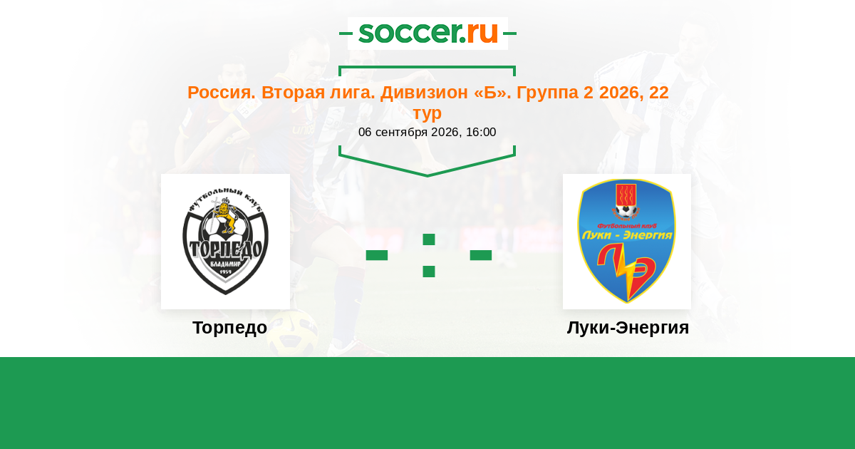 Россия. Вторая лига. Группа 2 09.08.2019 Луки-Энергия Логотип футбольный клуб Луки-Энергия (Великие Луки) 1:1 Логотип футбольный клуб Торпедо (Владимир) Торпедо