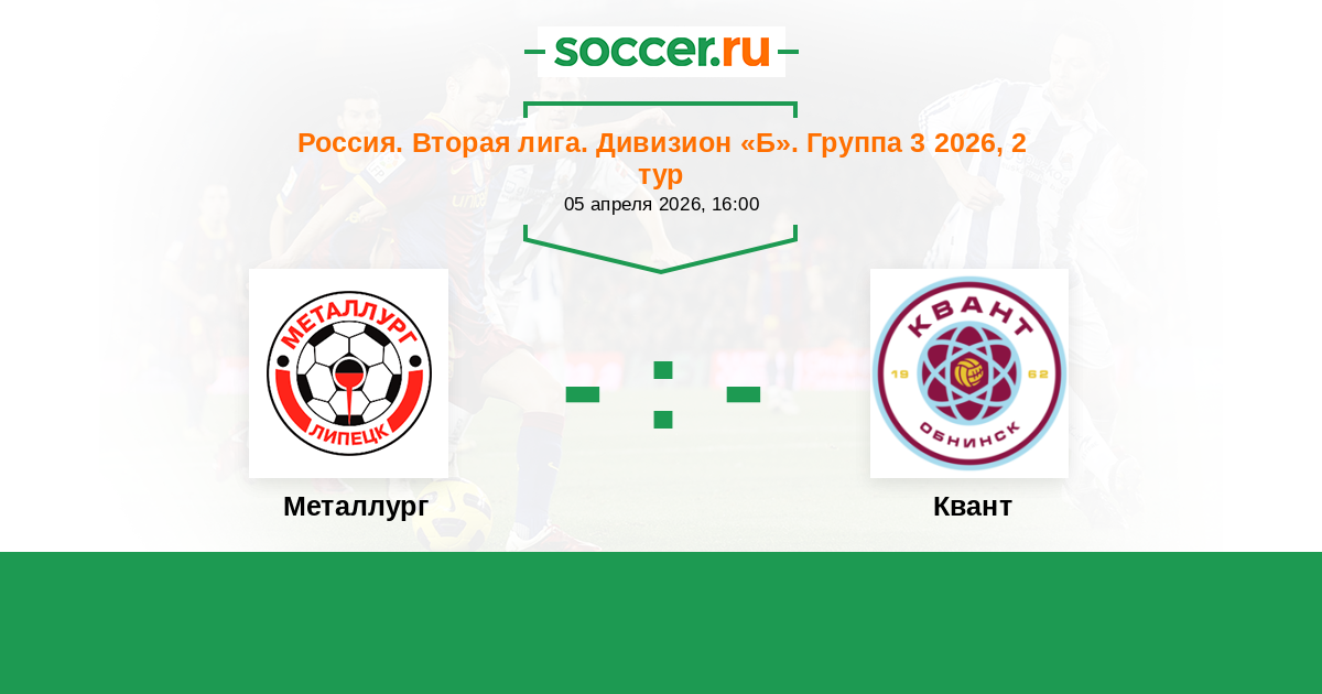 Россия. Вторая лига. Группа 3 18.04.2021 Металлург Логотип футбольный клуб Металлург (Липецк) 5:0 Логотип футбольный клуб Квант (Обнинск) Квант
