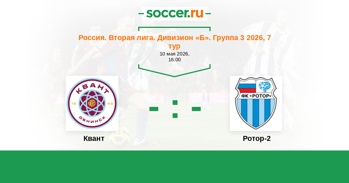 Россия. Вторая лига. Дивизион «Б». Группа 3 10.05.2025 Квант Логотип футбольный клуб Квант (Обнинск) 2:2 Логотип футбольный клуб Ротор-2 (Волгоград) Ротор-2