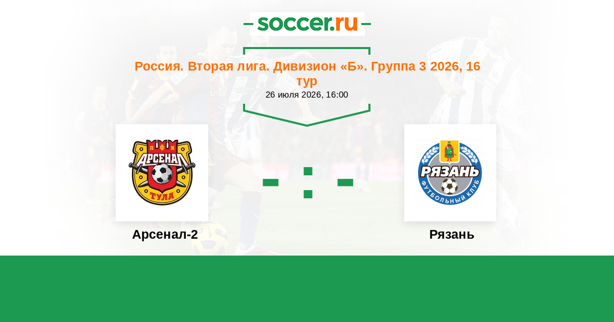 Россия. Вторая лига. Дивизион «Б». Группа 3 03.04.2026 Рязань Логотип футбольный клуб Рязань 0:0 Логотип футбольный клуб Арсенал-2 (Тула) Арсенал-2